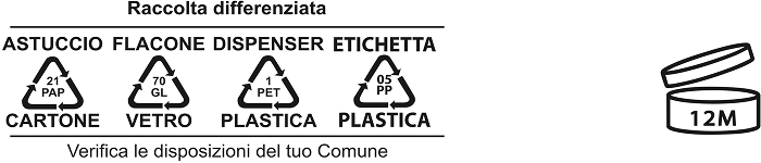 Uso esterno. Non portare il prodotto a diretto contatto con gli occhi e mucose. Non ingerire. Tenere fuori dalla portata dei bambini. Non utilizzare per i bambini al di sotto dei 3 anni.